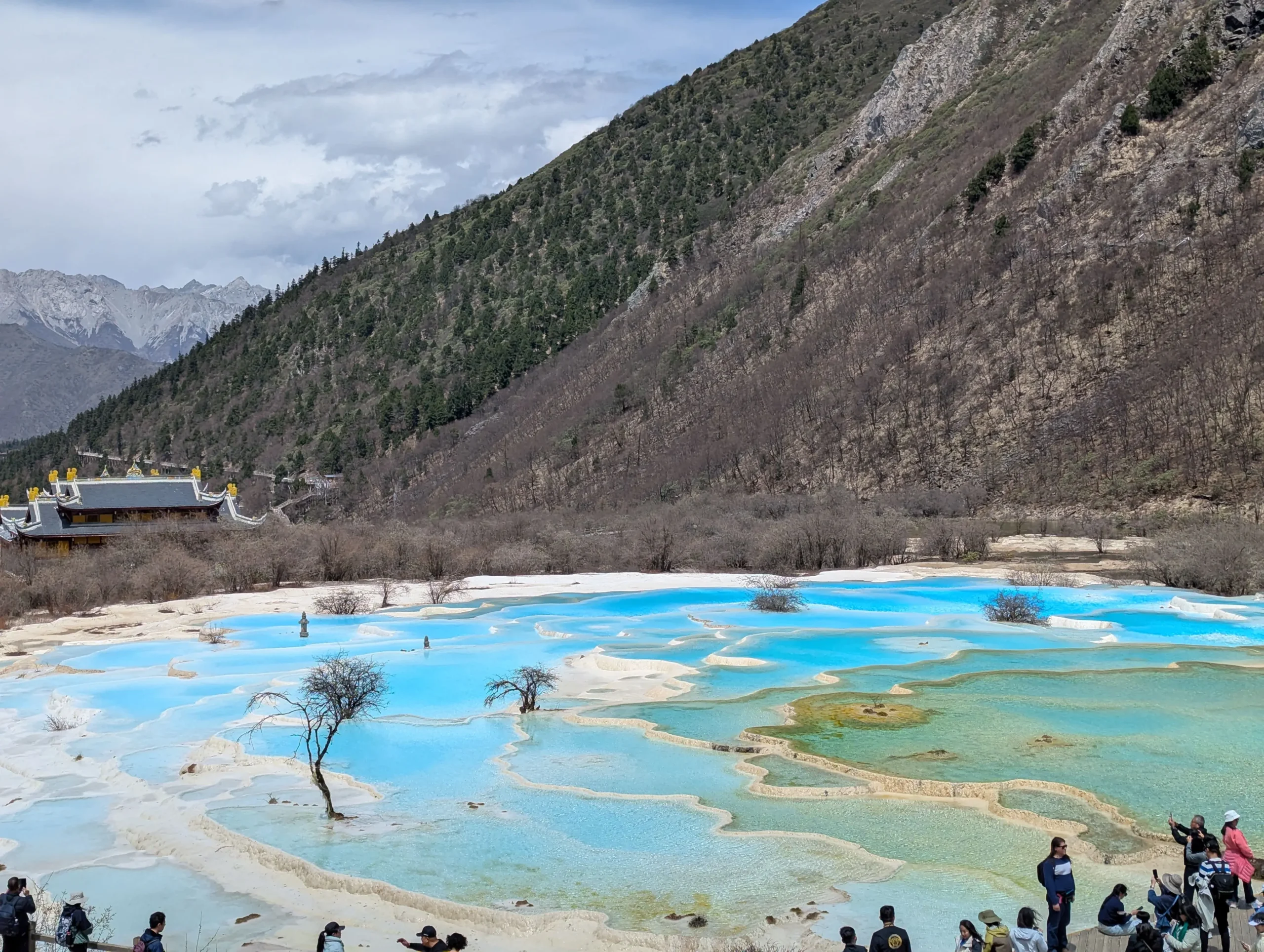 La principale attraction de Huanglong, ce sont ses bassins de travertin : des piscines naturelles formées par des dépôts de carbonate de calcium au fil des siècles. L’eau y est d’une transparence incroyable, avec des reflets allant du bleu turquoise au vert jade… parfois doré.